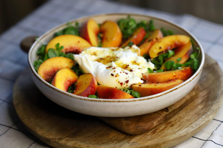 Grilled peach and burrata salad blends smoky peaches, creamy burrata, and peppery greens for a late-summer dish. Elegant, simple, and full of flavor.